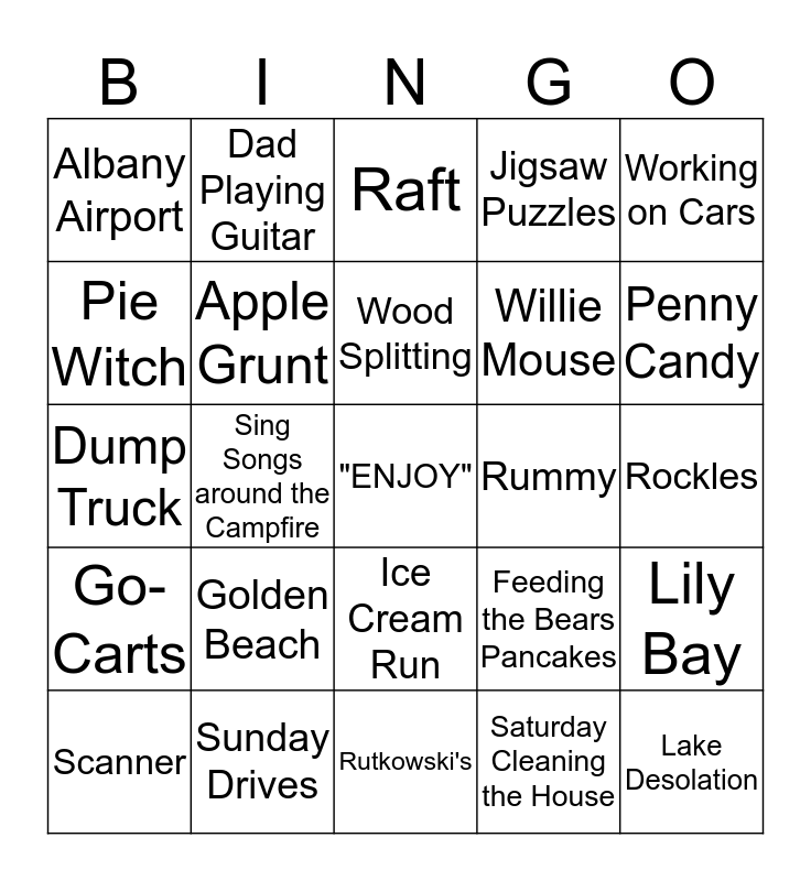 This bingo card has 25 words: Golden Beach, Rutkowski's, Wood Splitting, Scanner, Working on Cars, Albany Airport, Pie Witch, Dad Playing Guitar, Rummy, Ice Cream Run, Willie Mouse, Dump Truck, Feeding the Bears Pancakes, Lily Bay, Apple Grunt, Lake Desolation, Rockles, Raft, Penny Candy, Sing Songs around the Campfire, "ENJOY", Sunday Drives, Go-Carts, Jigsaw Puzzles and Saturday Cleaning the House.