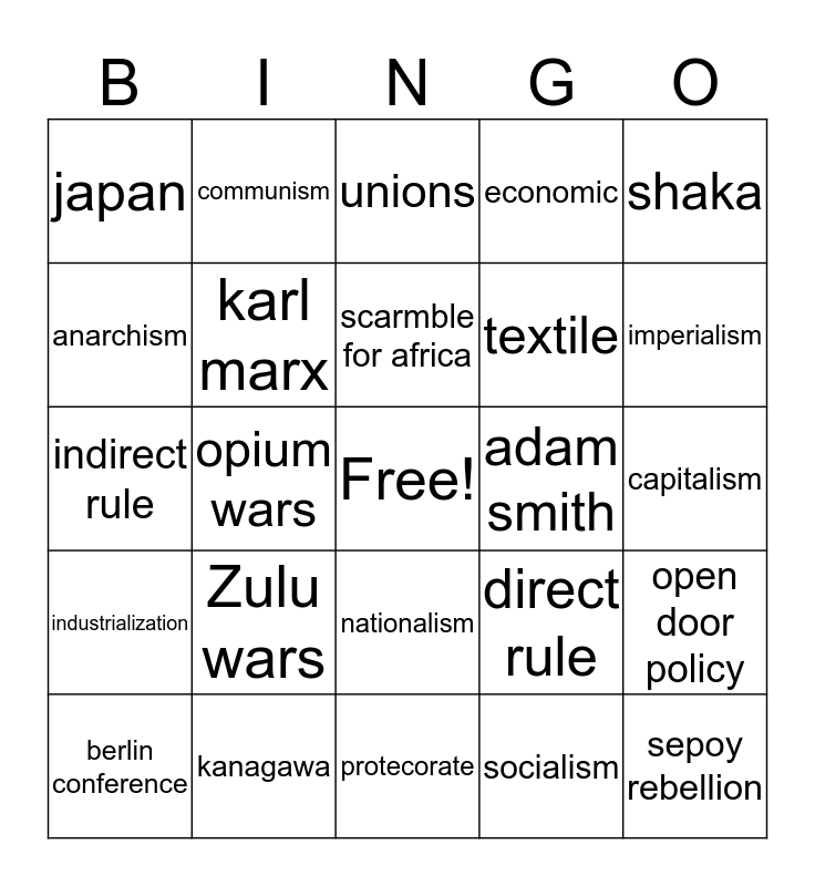 This bingo card has a free space and 24 words: Zulu wars, kanagawa, scarmble for africa, berlin conference, shaka, japan, anarchism, communism, adam smith, nationalism, textile, indirect rule, direct rule, open door policy, karl marx, socialism, capitalism, unions, imperialism, opium wars, sepoy rebellion, industrialization, economic and protecorate.
