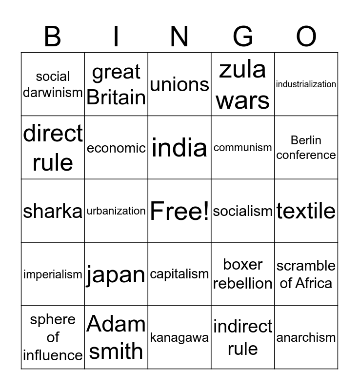 This bingo card has a free space and 24 words: japan, Adam smith, india, sphere of influence, industrialization, social darwinism, direct rule, great Britain, socialism, capitalism, communism, sharka, boxer rebellion, scramble of Africa, economic, indirect rule, textile, unions, Berlin conference, urbanization, anarchism, imperialism, zula wars and kanagawa.