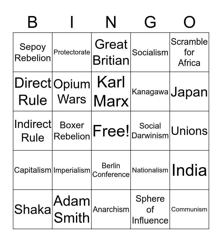 This bingo card has a free space and 24 words: Imperialism, Adam Smith, Karl Marx, Shaka, Scramble for Africa, Sepoy Rebelion, Direct Rule, Protectorate, Social Darwinism, Berlin Conference, Kanagawa, Indirect Rule, Nationalism, India, Opium Wars, Sphere of Influence, Unions, Great Britian, Japan, Boxer Rebelion, Communism, Capitalism, Socialism and Anarchism.
