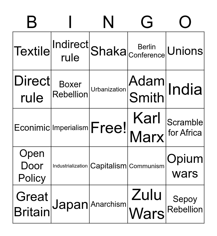 This bingo card has a free space and 24 words: Industrialization, Japan, Urbanization, Great Britain, Unions, Textile, Direct rule, Indirect rule, Karl Marx, Capitalism, Adam Smith, Econimic, Communism, Opium wars, Boxer Rebellion, Zulu Wars, Scramble for Africa, Shaka, India, Imperialism, Sepoy Rebellion, Open Door Policy, Berlin Conference and Anarchism.