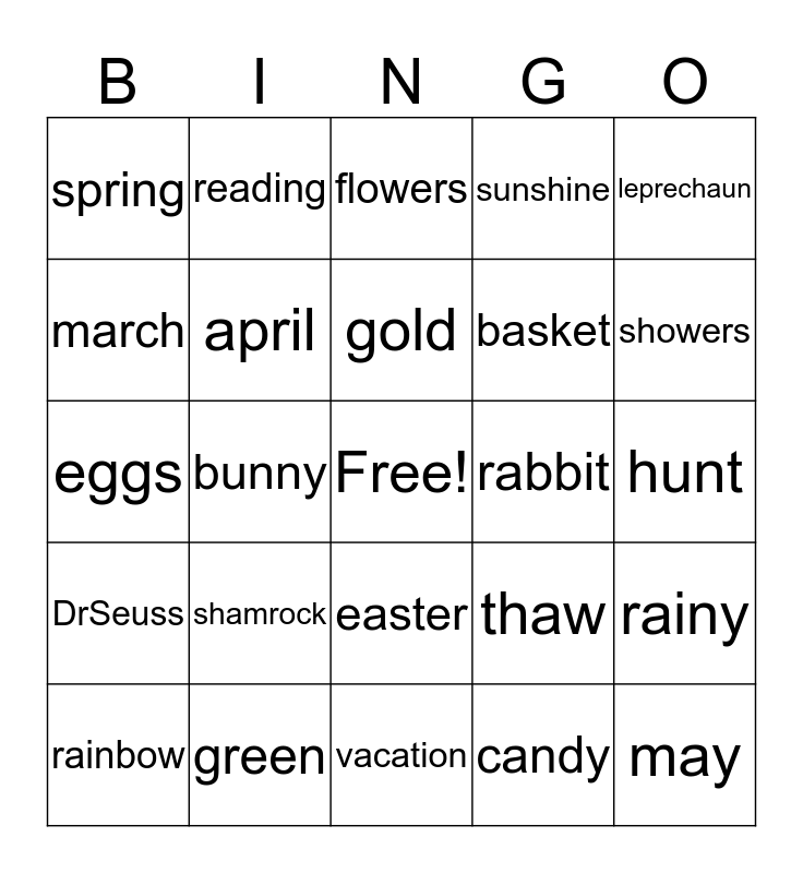 This bingo card has a free space and 24 words: shamrock, green, gold, rainbow, leprechaun, spring, march, reading, rabbit, easter, basket, eggs, thaw, rainy, april, candy, hunt, flowers, showers, bunny, may, DrSeuss, sunshine and vacation.