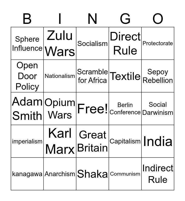 This bingo card has a free space and 24 words: Karl Marx, Anarchism, Scramble for Africa, kanagawa, Protectorate, Sphere Influence, Open Door Policy, Zulu Wars, Berlin Conference, Great Britain, Textile, Adam Smith, Capitalism, India, Nationalism, Communism, Social Darwinism, Socialism, Sepoy Rebellion, Opium Wars, Indirect Rule, imperialism, Direct Rule and Shaka.