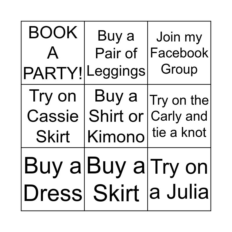 This bingo card has 9 words: Buy a Dress, Join my Facebook Group, Buy a Pair of Leggings, Try on Cassie Skirt, BOOK A PARTY!, Try on the Carly and tie a knot, Buy a Shirt or Kimono, Try on a Julia and Buy a Skirt.