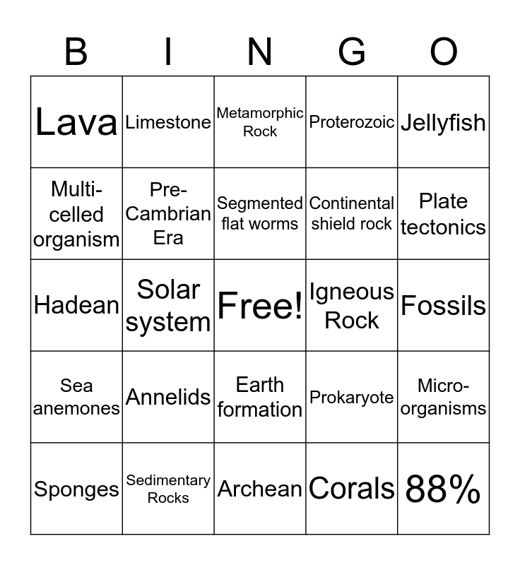 This bingo card has a free space and 24 words: Annelids, Sedimentary Rocks, Segmented flat worms, Sponges, Jellyfish, Lava, Multi-celled organism, Limestone, Igneous Rock, Earth formation, Continental shield rock, Hadean, Prokaryote, Micro-organisms, Pre-Cambrian Era, Corals, Fossils, Metamorphic Rock, Plate tectonics, Solar system, 88%, Sea anemones, Proterozoic and Archean.