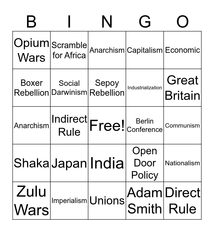 This bingo card has a free space and 24 words: Japan, Imperialism, Sepoy Rebellion, Zulu Wars, Economic, Opium Wars, Boxer Rebellion, Scramble for Africa, Berlin Conference, India, Industrialization, Anarchism, Open Door Policy, Nationalism, Social Darwinism, Adam Smith, Communism, Anarchism, Great Britain, Indirect Rule, Direct Rule, Shaka, Capitalism and Unions.