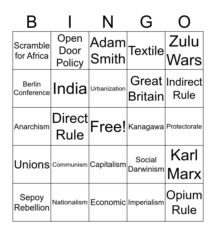 This bingo card has a free space and 24 words: Communism, Nationalism, Urbanization, Sepoy Rebellion, Zulu Wars, Scramble for Africa, Berlin Conference, Open Door Policy, Kanagawa, Capitalism, Great Britain, Anarchism, Social Darwinism, Karl Marx, India, Imperialism, Protectorate, Adam Smith, Indirect Rule, Direct Rule, Opium Rule, Unions, Textile and Economic.