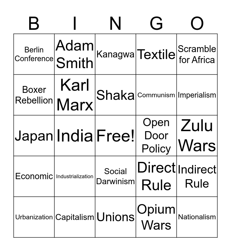 This bingo card has a free space and 24 words: Industrialization, Capitalism, Shaka, Urbanization, Scramble for Africa, Berlin Conference, Boxer Rebellion, Adam Smith, Open Door Policy, Social Darwinism, Communism, Japan, Direct Rule, Indirect Rule, Karl Marx, Opium Wars, Zulu Wars, Kanagwa, Imperialism, India, Nationalism, Economic, Textile and Unions.