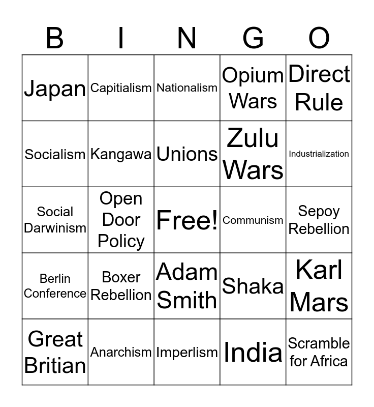 This bingo card has a free space and 24 words: Boxer Rebellion, Anarchism, Unions, Great Britian, Direct Rule, Japan, Socialism, Capitialism, Communism, Adam Smith, Zulu Wars, Social Darwinism, Shaka, Karl Mars, Kangawa, India, Sepoy Rebellion, Nationalism, Industrialization, Open Door Policy, Scramble for Africa, Berlin Conference, Opium Wars and Imperlism.