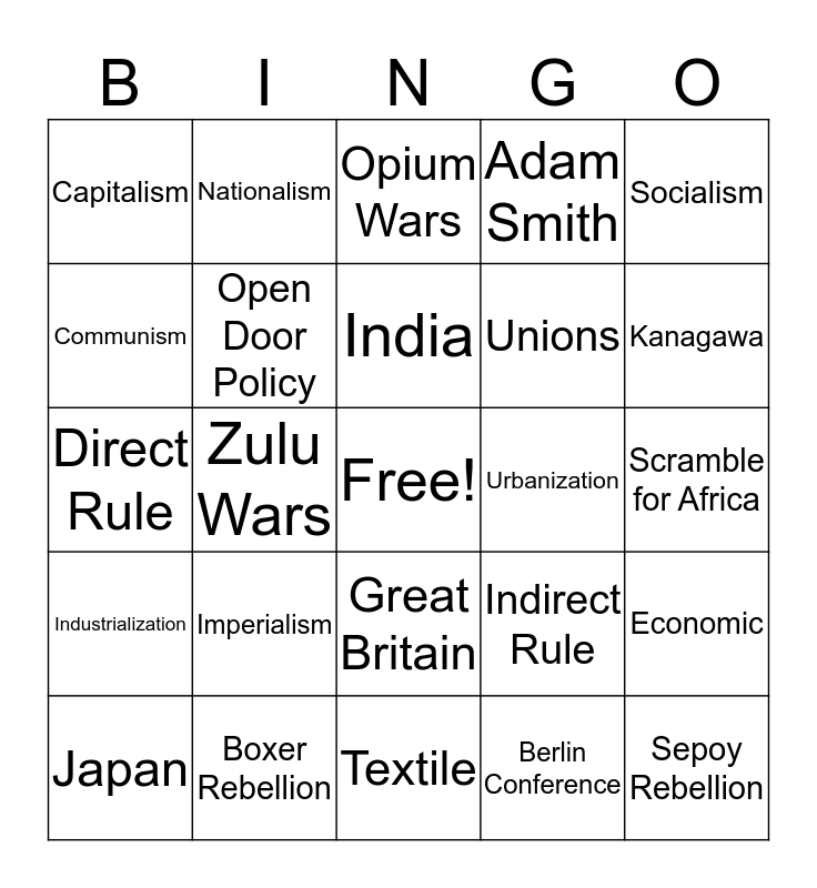 This bingo card has a free space and 24 words: Imperialism, Boxer Rebellion, India, Japan, Socialism, Capitalism, Communism, Nationalism, Urbanization, Great Britain, Unions, Direct Rule, Indirect Rule, Economic, Open Door Policy, Berlin Conference, Scramble for Africa, Opium Wars, Kanagawa, Zulu Wars, Sepoy Rebellion, Industrialization, Adam Smith and Textile.