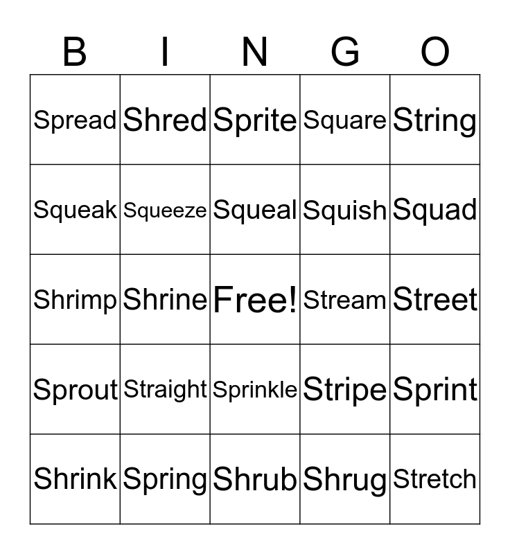 This bingo card has a free space and 24 words: Straight, Spring, Squeal, Shrink, String, Spread, Squeak, Shred, Stream, Sprinkle, Squish, Shrimp, Stripe, Sprint, Squeeze, Shrug, Street, Sprite, Squad, Shrine, Stretch, Sprout, Square and Shrub.