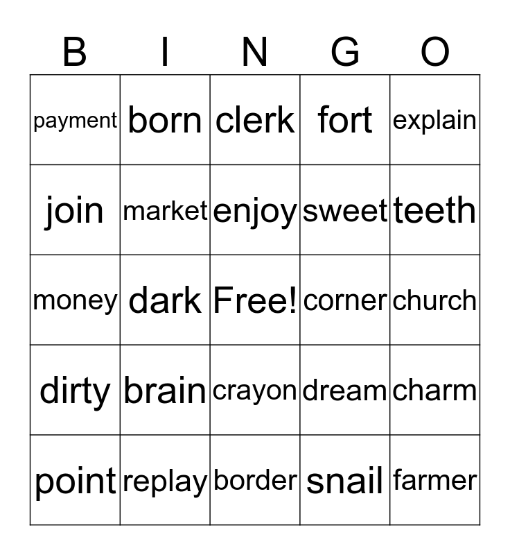 This bingo card has a free space and 24 words: brain, replay, enjoy, point, explain, payment, join, born, corner, crayon, sweet, money, dream, charm, market, snail, church, clerk, teeth, dark, farmer, dirty, fort and border.