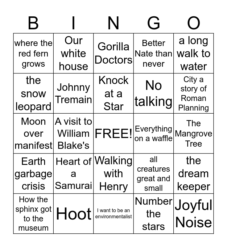 This bingo card has a free space and 24 words: Heart of a Samurai, Hoot, Knock at a Star, How the sphinx got to the museum, a long walk to water, where the red fern grows, the snow leopard, Our white house, Everything on a waffle, Walking with Henry, No talking, Moon over manifest, all creatures great and small, the dream keeper, Johnny Tremain, Number the stars, The Mangrove Tree, Gorilla Doctors, City a story of Roman Planning, A visit to William Blake's, Joyful Noise, Earth garbage crisis, Better Nate than never and I want to be an environmentalist.