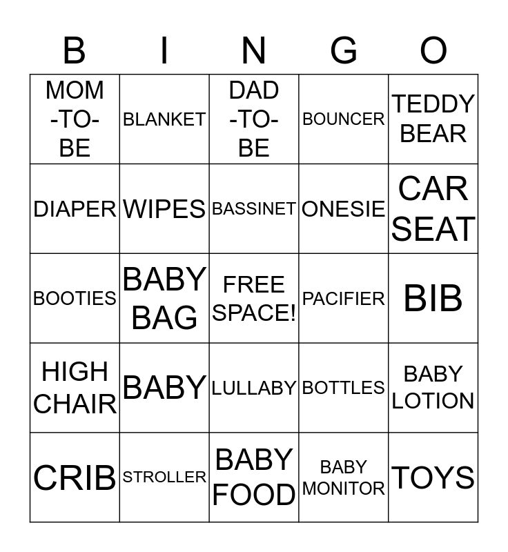 This bingo card has a free space and 24 words: BABY, STROLLER, BASSINET, CRIB, TEDDY BEAR, MOM -TO- BE, DIAPER, BLANKET, PACIFIER, LULLABY, ONESIE, BOOTIES, BOTTLES, BABY LOTION, WIPES, BABY MONITOR, BIB, DAD -TO- BE, CAR SEAT, BABY BAG, TOYS, HIGH CHAIR, BOUNCER and BABY FOOD.