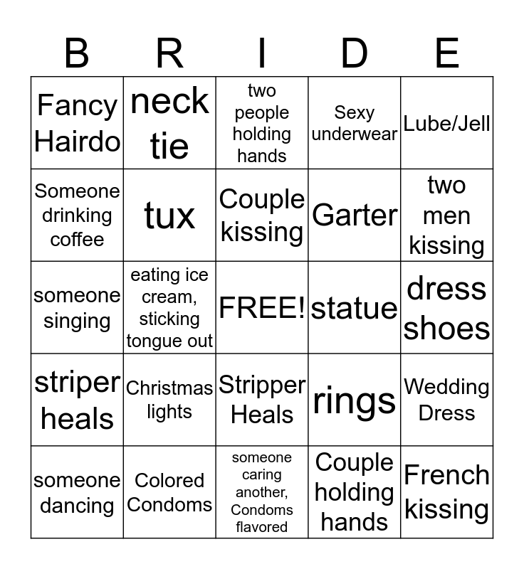 This bingo card has a free space and 26 words: Stripper Heals, Couple holding hands, Couple kissing, Colored Condoms, Lube/Jell, Fancy Hairdo, Someone drinking coffee, neck tie, dress shoes, rings, Garter, someone singing, Wedding Dress, someone dancing, eating ice cream, sticking tongue out, hair bump, Sexy underwear, striper heals, two people holding hands, French kissing, two men kissing, someone caring another, Condoms flavored, statue, Christmas lights, tux and baby.