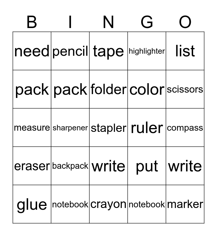 This bingo card has 25 words: backpack, crayon, folder, glue, list, need, pack, pencil, ruler, write, color, measure, put, write, pack, marker, compass, tape, scissors, sharpener, stapler, notebook, eraser, highlighter and notebook.