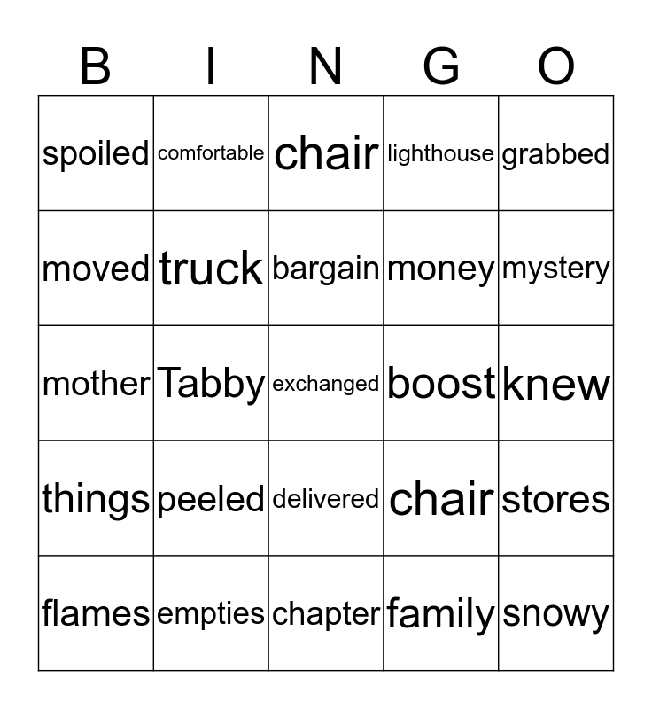 This bingo card has a free space and 24 words: peeled, empties, bargain, flames, grabbed, spoiled, moved, comfortable, boost, delivered, money, mother, chair, stores, truck, family, knew, chair, mystery, Tabby, snowy, things, lighthouse and chapter.