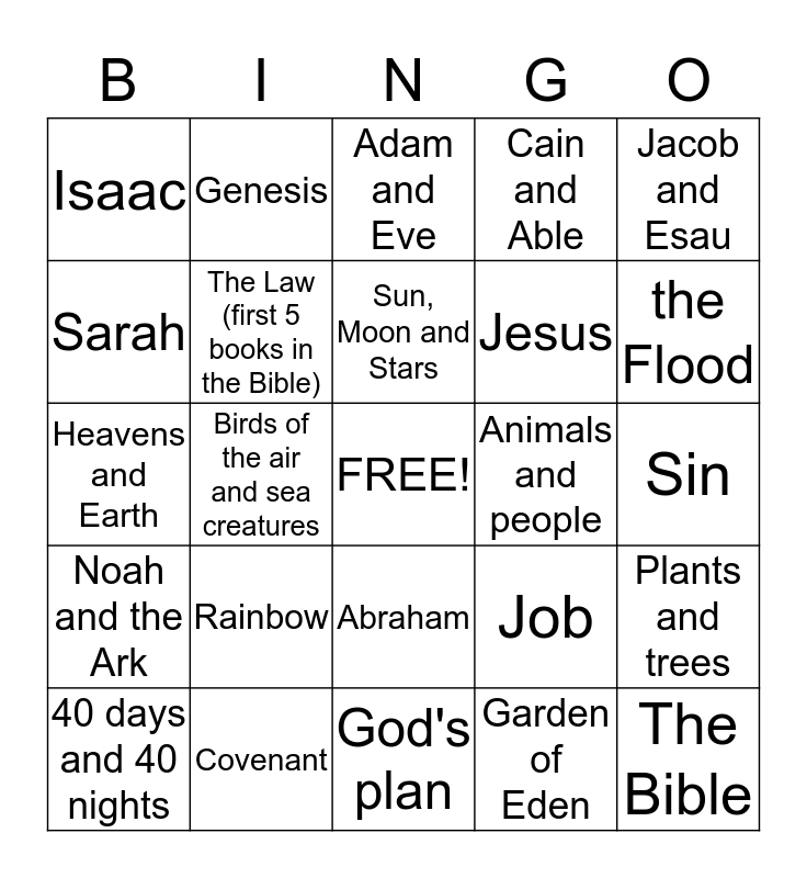 This bingo card has a free space and 24 words: Rainbow, Covenant, Sun, Moon and Stars, 40 days and 40 nights, Jacob and Esau, Isaac, Sarah, Genesis, Animals and people, Abraham, Jesus, Heavens and Earth, Job, Plants and trees, The Law (first 5 books in the Bible), Garden of Eden, Sin, Adam and Eve, the Flood, Birds of the air and sea creatures, The Bible, Noah and the Ark, Cain and Able and God's plan.