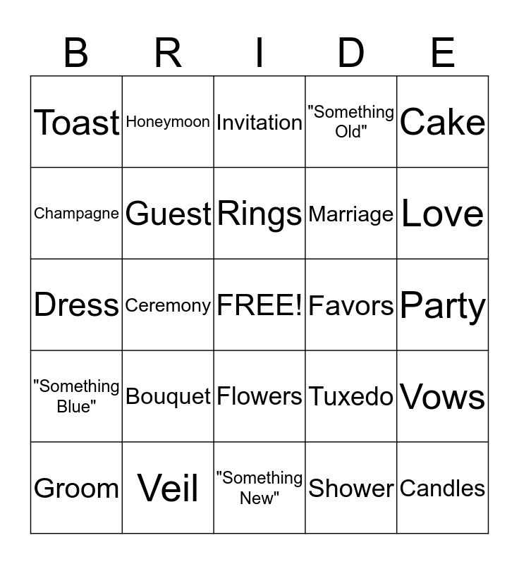 This bingo card has a free space and 24 words: Bouquet, Veil, Rings, Groom, Cake, Toast, Champagne, Honeymoon, Favors, Flowers, Marriage, Dress, Tuxedo, Vows, Guest, Shower, Party, Invitation, Love, Ceremony, Candles, "Something Blue", "Something Old" and "Something New".