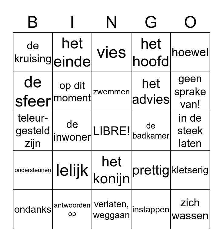 This bingo card has a free space and 51 words: 's avonds, de avond, zich wassen, verlegen, verlaten, weggaan, lelijk, gaan slapen, het einde, chagrijnig zijn, de sfeer, wandelen, op dit moment, het hoofd, kletserig, prettig, de ruzie, onafschei- delijk, zwemmen, de badkamer, wensen, hoewel, de inwoner, instappen, de kruising, het advies, de rotonde, inbegrepen, geen sprake van!, echter, ondanks, vies, met het vliegtuig, de sluiting, gehaast, de stoplichten, het voedsel, antwoorden op, dat wil zeggen, de vogel, op, strijden tegen, in de steek laten, ondersteunen, het afval, de vis, de kip, de maatregel, teleur- gesteld zijn, aanmoedigen, soms, het konijn and straffen.