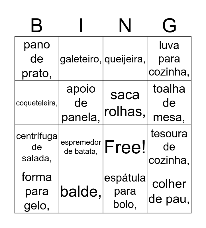 This bingo card has 19 words: Free!, descascador de legumes,, queijeira,, colher de pau,, tesoura de cozinha,, coqueteleira,, espátula para bolo,, pano de prato,, galeteiro,, centrífuga de salada,, espremedor de batata,, apoio de panela,, saca rolhas,, balde,, forma para gelo,, conjunto americano,, luva para cozinha,, toalha de mesa, and tábua de carne,.