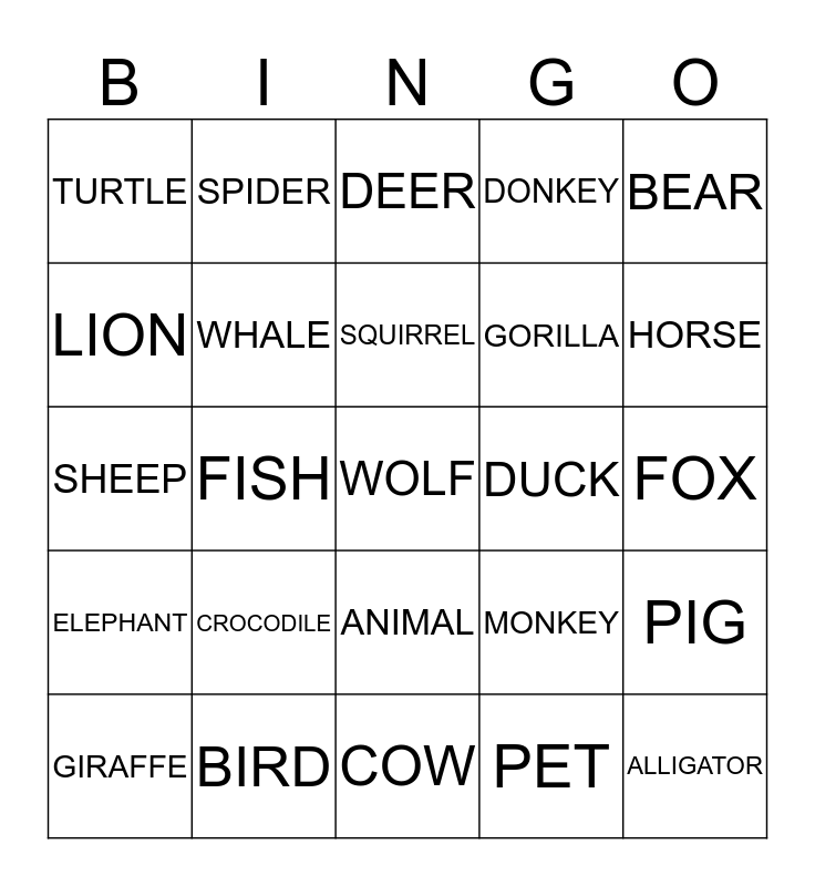 This bingo card has 26 words: ANIMAL, PET, SQUIRREL, BIRD, BEAR, TURTLE, LION, SPIDER, FOX, MONKEY, GORILLA, SHEEP, PIG, GIRAFFE, FISH, DOLPHIN, DONKEY, ELEPHANT, DEER, WOLF, HORSE, COW, DUCK, CROCODILE, WHALE and ALLIGATOR.