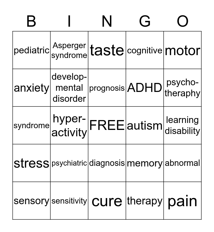 This bingo card has a free space and 28 words: abnormal, vaccines, ADHD, therapy, anxiety, taste, Asperger syndrome, stress, autism, sensory, syndrome, cognitive, sensitivity, cure, psycho-theraphy, depression, psychiatric, develop- mental disorder, prognosis, diagnosis, pediatric, genetic, pain, hyper- activity, learning disability, memory, motor and neurological.
