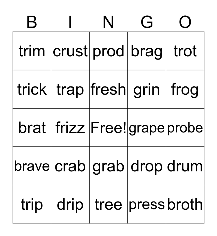 This bingo card has a free space and 24 words: crab, drip, fresh, trip, trot, trim, trick, crust, grape, grab, grin, brat, drop, drum, trap, press, probe, prod, frog, frizz, broth, brave, brag and tree.
