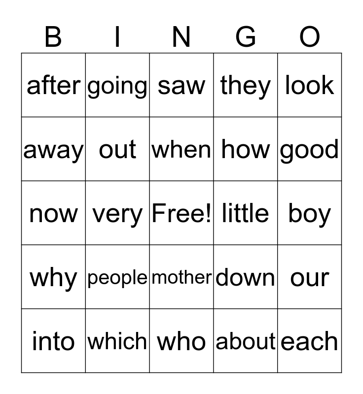 This bingo card has a free space and 24 words: people, which, when, into, look, after, away, going, little, mother, how, now, down, our, out, about, boy, saw, good, very, each, why, they and who.