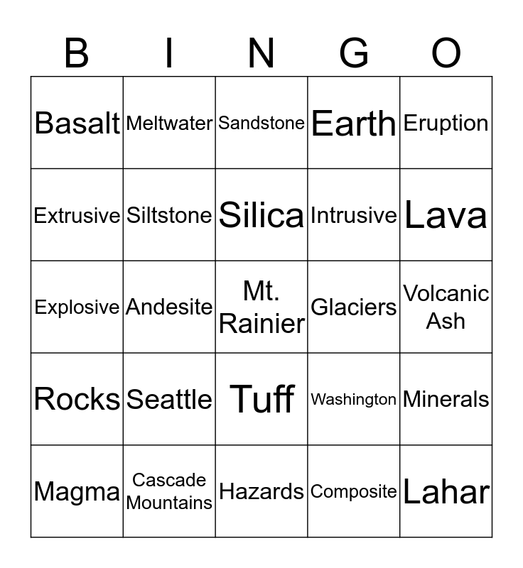 This bingo card has a free space and 30 words: Cascade Mountains, Juan De Fuca, Andesite, Rhyolite, Basalt, Sandstone, Siltstone, Tuff, Glaciers, Hazards, Volcanic Ash, Lahar, Composite, Arc Volcano, Lava, Subduction Zone, Washington, Rocks, Seattle, Eruption, Explosive, Volcano, Meltwater, Intrusive, Extrusive, Earth, Minerals, Magma, Silica and Viscosity.
