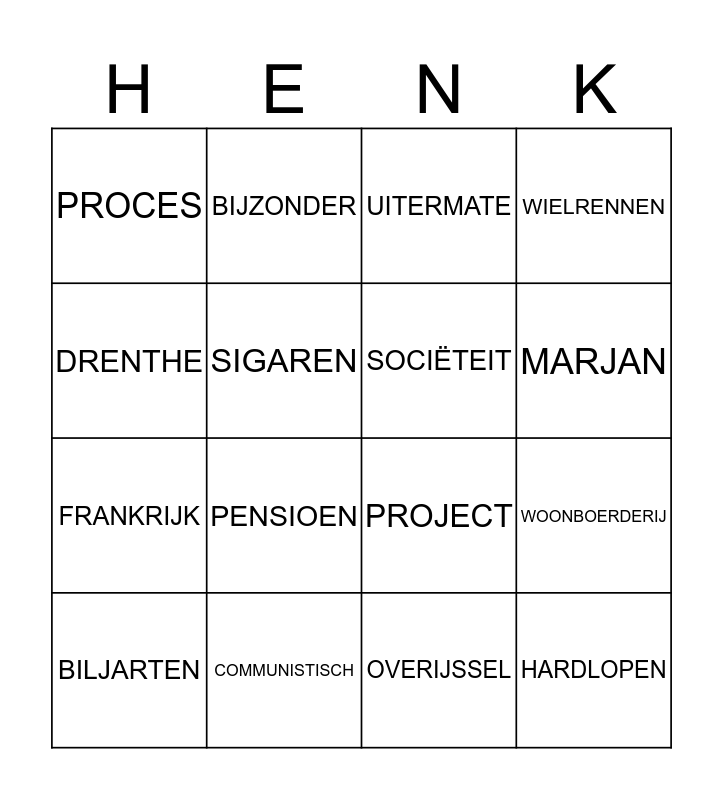 This bingo card has 16 words: COMMUNISTISCH, WOONBOERDERIJ, UITERMATE, PROCES, FRANKRIJK, BIJZONDER, PROJECT, OVERIJSSEL, DRENTHE, SIGAREN, BILJARTEN, WIELRENNEN, PENSIOEN, MARJAN, SOCIËTEIT and HARDLOPEN.