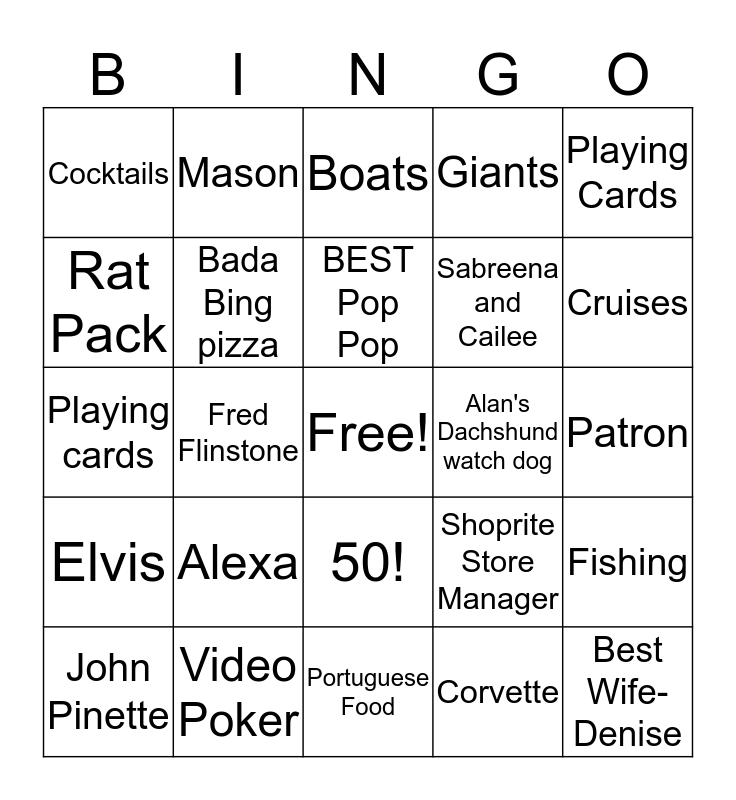 This bingo card has a free space and 24 words: Alexa, Video Poker, BEST Pop Pop, John Pinette, Playing Cards, Cocktails, Rat Pack, Mason, Alan's Dachshund watch dog, 50!, Sabreena and Cailee, Playing cards, Shoprite Store Manager, Fishing, Bada Bing pizza, Corvette, Patron, Boats, Cruises, Fred Flinstone, Best Wife-Denise, Elvis, Giants and Portuguese Food.