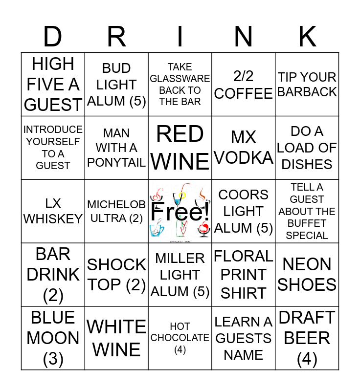 This bingo card has a free space and 24 words: SHOCK TOP (2), WHITE WINE, RED WINE, BLUE MOON (3), TIP YOUR BARBACK, HIGH FIVE A GUEST, INTRODUCE YOURSELF TO A GUEST, BUD LIGHT ALUM (5), COORS LIGHT ALUM (5), MILLER LIGHT ALUM (5), MX VODKA, LX WHISKEY, FLORAL PRINT SHIRT, NEON SHOES, MAN WITH A PONYTAIL, LEARN A GUESTS NAME, TELL A GUEST ABOUT THE BUFFET SPECIAL, TAKE GLASSWARE BACK TO THE BAR, DO A LOAD OF DISHES, MICHELOB ULTRA (2), DRAFT BEER (4), BAR DRINK (2), 2/2 COFFEE and HOT CHOCOLATE (4).