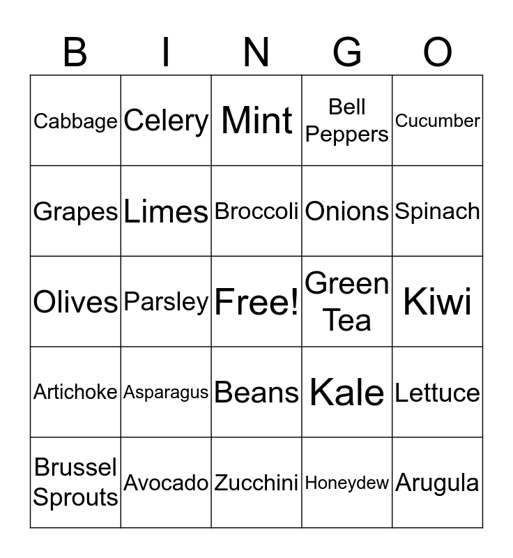 This bingo card has a free space and 24 words: Asparagus, Avocado, Broccoli, Brussel Sprouts, Cucumber, Cabbage, Grapes, Celery, Green Tea, Beans, Onions, Olives, Kale, Lettuce, Limes, Honeydew, Kiwi, Mint, Spinach, Parsley, Arugula, Artichoke, Bell Peppers and Zucchini.