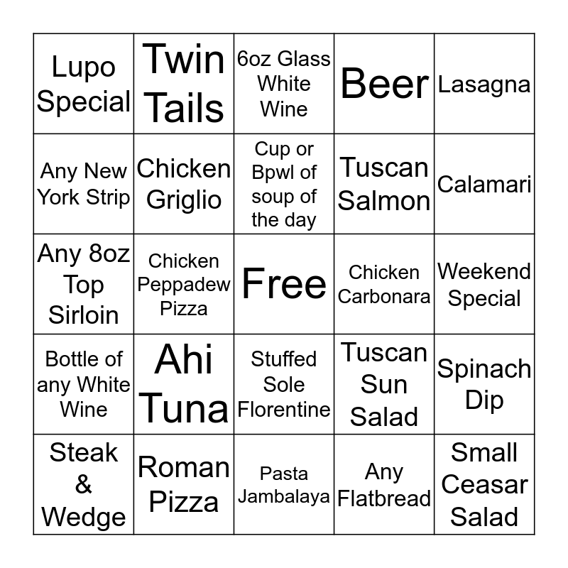 This bingo card has a free space and 24 words: Ahi Tuna, Roman Pizza, Cup or Bpwl of soup of the day, Steak & Wedge, Lasagna, Lupo Special, Any New York Strip, Twin Tails, Chicken Carbonara, Stuffed Sole Florentine, Tuscan Salmon, Any 8oz Top Sirloin, Tuscan Sun Salad, Spinach Dip, Chicken Griglio, Any Flatbread, Weekend Special, 6oz Glass White Wine, Calamari, Chicken Peppadew Pizza, Small Ceasar Salad, Bottle of any White Wine, Beer and Pasta Jambalaya.