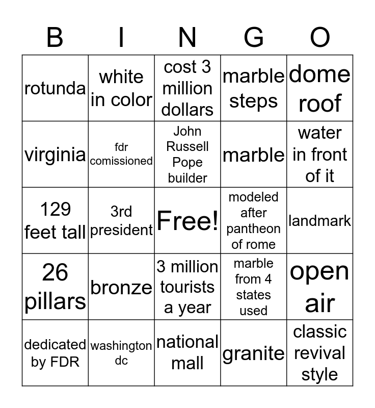 This bingo card has a free space and 24 words: bronze, washington dc, John Russell Pope builder, dedicated by FDR, dome roof, rotunda, virginia, white in color, modeled after pantheon of rome, 3 million tourists a year, marble, 129 feet tall, marble from 4 states used, open air, fdr comissioned, granite, landmark, cost 3 million dollars, water in front of it, 3rd president, classic revival style, 26 pillars, marble steps and national mall.