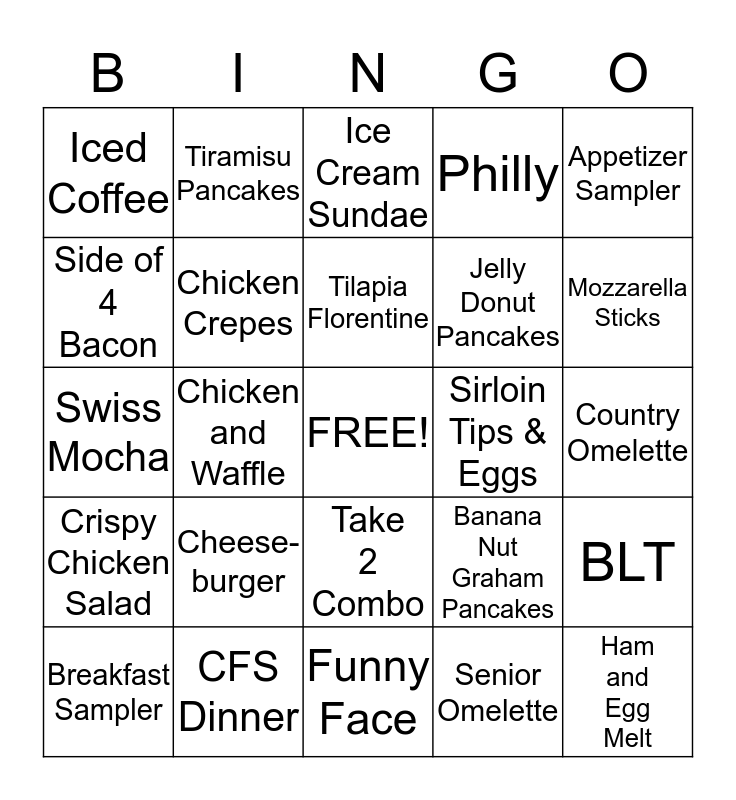 This bingo card has a free space and 24 words: Cheese-burger, CFS Dinner, Tilapia Florentine, Breakfast Sampler, Appetizer Sampler, Iced Coffee, Side of 4 Bacon, Tiramisu Pancakes, Sirloin Tips & Eggs, Take 2 Combo, Jelly Donut Pancakes, Swiss Mocha, Banana Nut Graham Pancakes, BLT, Chicken Crepes, Senior Omelette, Country Omelette, Ice Cream Sundae, Mozzarella Sticks, Chicken and Waffle, Ham and Egg Melt, Crispy Chicken Salad, Philly and Funny Face.