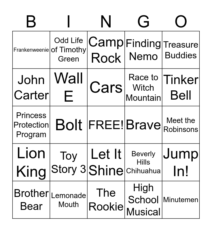 This bingo card has a free space and 24 words: Toy Story 3, Lemonade Mouth, Cars, Brother Bear, Treasure Buddies, Frankenweenie, John Carter, Odd Life of Timothy Green, Brave, Let It Shine, Race to Witch Mountain, Princess Protection Program, Beverly Hills Chihuahua, Jump In!, Wall E, High School Musical, Meet the Robinsons, Camp Rock, Tinker Bell, Bolt, Minutemen, Lion King, Finding Nemo and The Rookie.