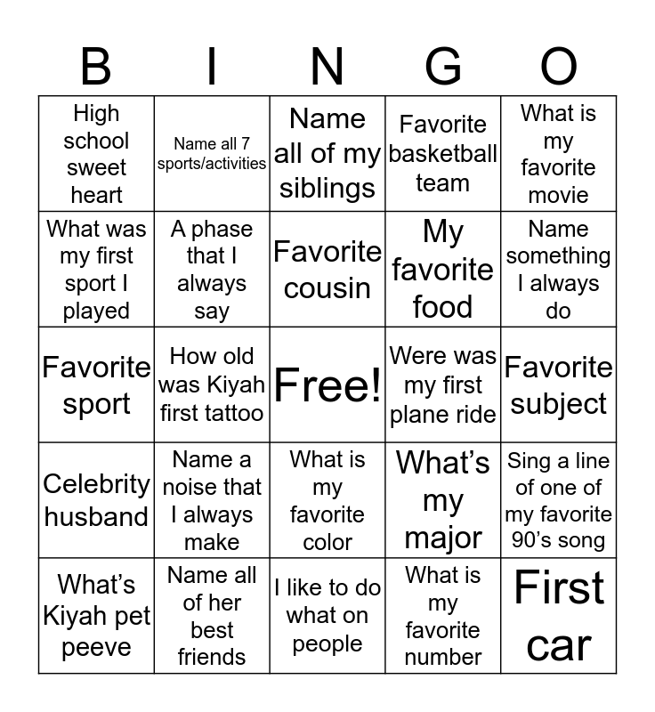 This bingo card has a free space and 26 words: What is my favorite color, What is my favorite number, Favorite cousin, Name all of her best friends, What is my favorite movie, High school sweet heart, What was my first sport I played, Name all 7 sports/activities, Favorite subject, What’s my major, My favorite food, Favorite sport, Sing a line of one of my favorite 90’s song, What’s Kiyah pet peeve, How old was Kiyah first tattoo, Name 2 of my child hood nick names, Favorite basketball team, Celebrity husband, Name all of my siblings, First car, Name something I always do, I like to do what on people, Were was my first plane ride, Name a noise that I always make, A phase that I always say and Name my middle & highschool and both colleges.