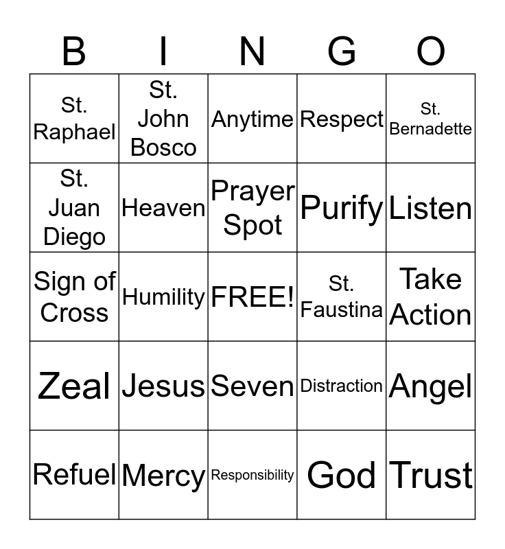 This bingo card has a free space and 24 words: Jesus, Mercy, Prayer Spot, Refuel, St. Bernadette, St. Raphael, St. Juan Diego, St. John Bosco, St. Faustina, Seven, Purify, Sign of Cross, Distraction, Angel, Heaven, God, Take Action, Anytime, Listen, Humility, Trust, Zeal, Respect and Responsibility.
