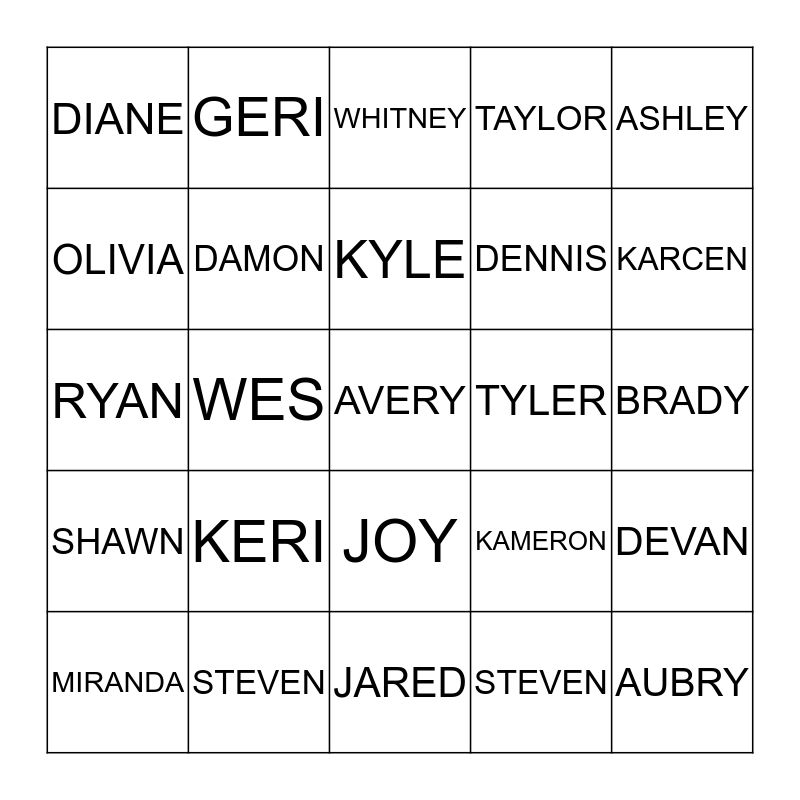 This bingo card has a free space and 24 words: KERI, STEVEN, KYLE, MIRANDA, ASHLEY, DIANE, OLIVIA, GERI, TYLER, JOY, DENNIS, RYAN, KAMERON, DEVAN, DAMON, STEVEN, BRADY, WHITNEY, KARCEN, WES, AUBRY, SHAWN, TAYLOR and JARED.