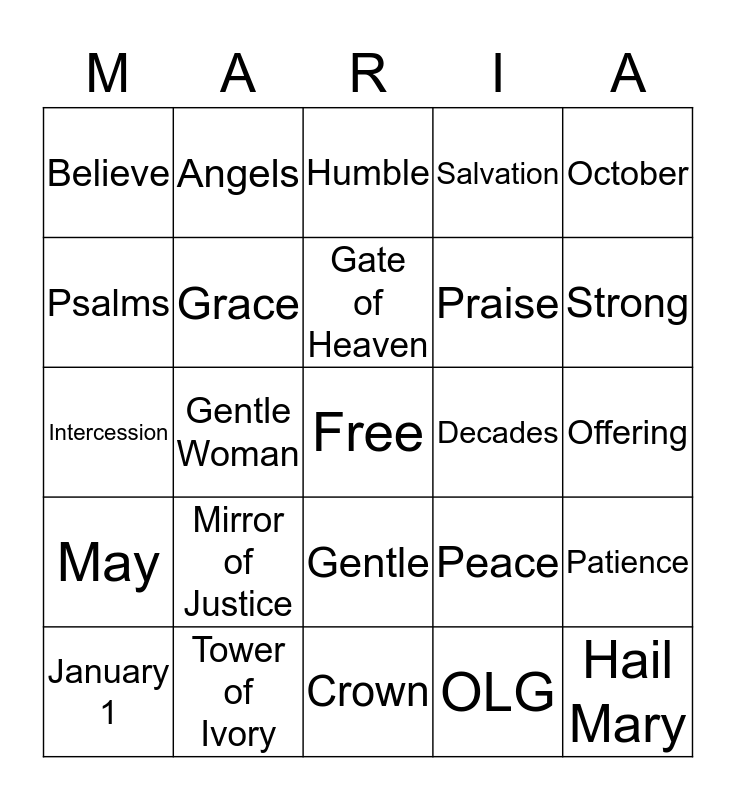 This bingo card has a free space and 24 words: Mirror of Justice, Tower of Ivory, Gate of Heaven, January 1, October, Believe, Psalms, Angels, Decades, Gentle, Praise, Intercession, Peace, Patience, Grace, OLG, Offering, Humble, Strong, Gentle Woman, Hail Mary, May, Salvation and Crown.