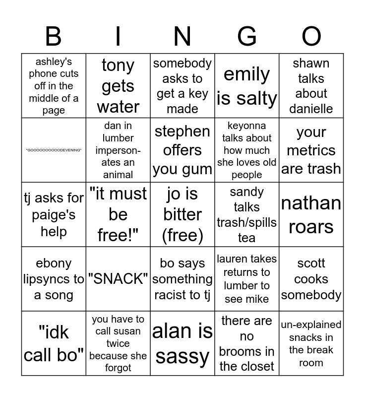 This bingo card has a free space and 24 words: "SNACK", you have to call susan twice because she forgot, stephen offers you gum, "idk call bo", shawn talks about danielle, ashley's phone cuts off in the middle of a page, "GOOOOOOOOOODEVENING", tony gets water, sandy talks trash/spills tea, bo says something racist to tj, keyonna talks about how much she loves old people, tj asks for paige's help, lauren takes returns to lumber to see mike, scott cooks somebody, dan in lumber imperson-ates an animal, there are no brooms in the closet, nathan roars, somebody asks to get a key made, your metrics are trash, "it must be free!", un-explained snacks in the break room, ebony lipsyncs to a song, emily is salty and alan is sassy.