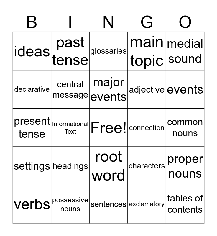 This bingo card has a free space and 36 words: retell, key details, understanding, central message, characters, settings, major events, initial sound, medial sound, final sound, Informational Text, main topic, main idea, connection, events, ideas, text features, headings, tables of contents, glossaries, common nouns, proper nouns, possessive nouns, verbs, sentences, past tense, present tense, future tense, adjective, declarative, interrogative, imperative, exclamatory, root word, sort and categories.