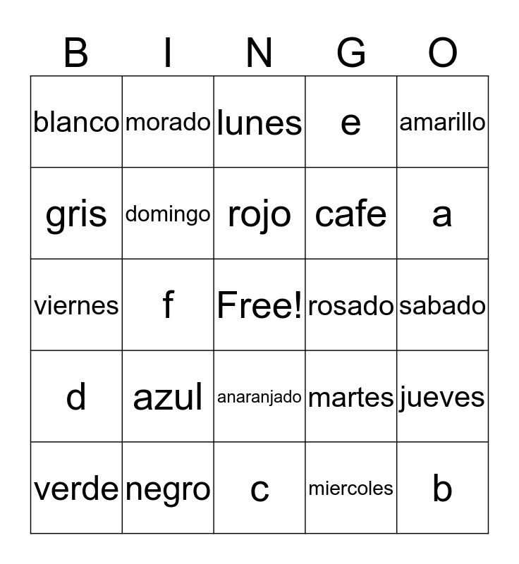 This bingo card has a free space and 24 words: azul, negro, rojo, verde, amarillo, blanco, gris, morado, rosado, anaranjado, cafe, viernes, martes, jueves, domingo, miercoles, sabado, lunes, a, f, b, d, e and c.