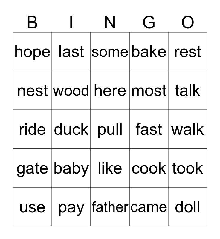 This bingo card has 25 words: baby, father, here, use, rest, hope, nest, last, fast, like, most, ride, cook, took, wood, doll, walk, some, talk, duck, pull, pay, gate, bake and came.