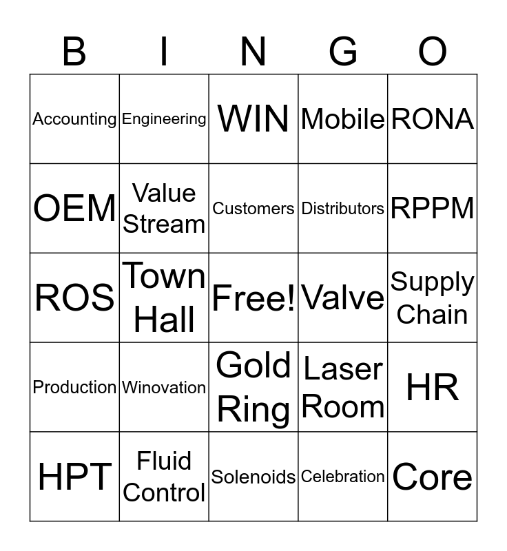 This bingo card has a free space and 44 words: Centennial, Core, Cell, HPT, Manifold, Celebration, WIN, Safety, RONA, Fluid Control, Mobile, Valve, Gold Ring, Winovation, Automation, Solenoids, Win Strategy, ROS, COPQ, RPPM, Engineering, Shipping, Customer Service, Accounting, Marketing, Supply Chain, IT, Lab, Laser Room, Production, Manufacturing, HR, Maintenance, Receiving, Town Hall, Win Scorecard, COPQ, Parker, Customers, OEM, Distributors, TMs, Value Stream and Business Unit.