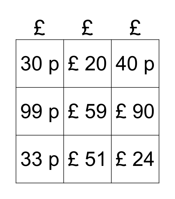 This bingo card has a free space and 8 words: £ 90, 40 p, £ 20, 33 p, 30 p, £ 24, 99 p and £ 51.