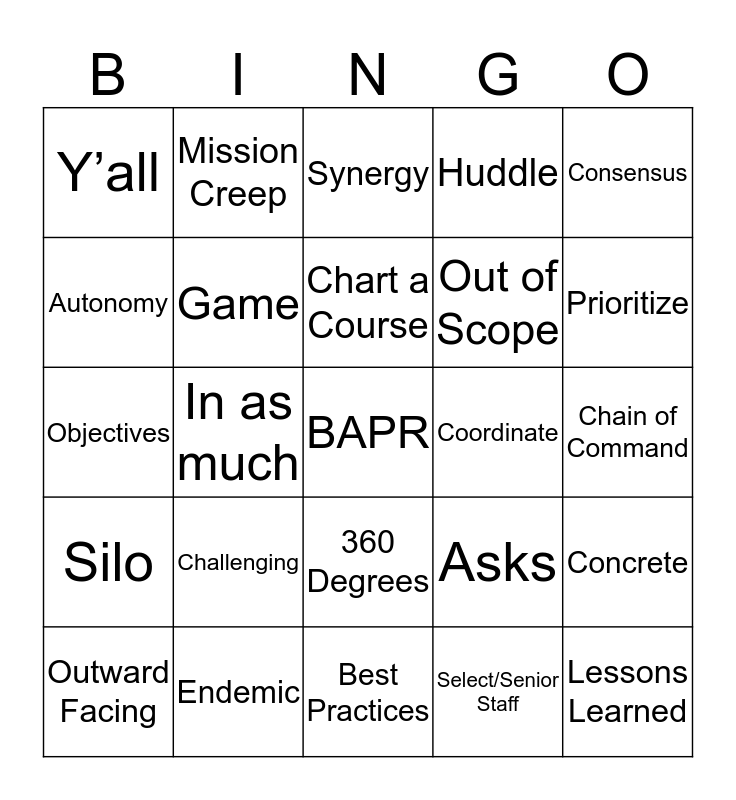 This bingo card has a free space and 30 words: Endemic, Boots on the ground, In as much, Crosswalk, Y’all, Synergy, Game, 360 Degrees, Coordinate, Best Practices, Chain of Command, Lessons Learned, Select/Senior Staff, Progressive, Prioritize, Modeling, Asks, Silo, Challenging, Consensus, Objectives, Mission Focused, Mission Creep, Out of Scope, Autonomy, Huddle, Concrete, Outward Facing, Chart a Course and Cross-train.