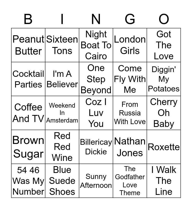 This bingo card has 51 words: Hallelujah!, Coz I Luv You, Three Steps to Heaven, Sunny Afternoon, Red Red Wine, Biilie Jean, Sixteen Tons, Do The Bus Stop, Cocktail Parties, Paint It Black, I'm A Believer, London Girls, Roxette, Nathan Jones, The Pink Panther Theme, Good Times, One Step Beyond, From Russia With Love, Son Of A Preacher Man, Got The Love, Weekend In Amsterdam, The Godfather Love Theme, Peanut Butter, Come Fly With Me, Drink The Beer Barrel Dry, I Walk The Line, Diggin' My Potatoes, I Want Your Love, 54 46 Was My Number, Night Boat To Cairo, I Ate Up The Apple Tree, Louie Louie, It Must Be Love, Train to Skaville, Green Onions, Blue Suede Shoes, Five Guys Named Moe, Way To Amarillo, Parklife, Love Her Madly, Cherry Oh Baby, Brown Sugar, White Christmas, Heat Wave, Champagne Supernova, Get Off Of My Cloud, Coffee And TV, Car Wash, One Scotch,One Soda,.., Billericay Dickie and Say A Little Prayer.
